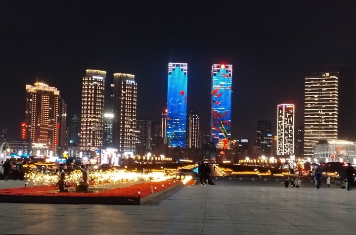 亞洲最大廣場:大連星海廣場-雙子座大廈燈光秀廣告