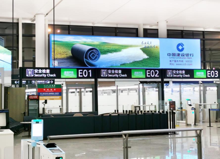 T2國內出發安檢通道右側墻體上方led大屏廣告