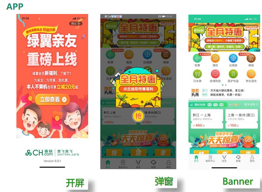 春秋航空APP開屏、彈窗、Banner、聯(lián)合投放澳門旅游推廣畫面,增加沖擊力與曝光量。