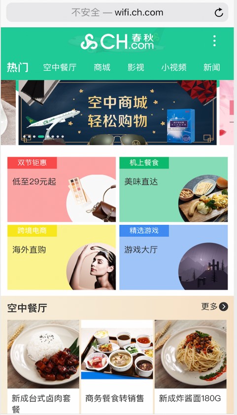 春秋航空空中Wi-Fi連接子版塊包含動(dòng)態(tài)、靜態(tài)的展示廣告,視頻廣告及不同主題的內(nèi)容合作。