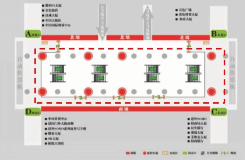 4、站廳西南側D出口:北京銀泰中心、中環世貿中心、安邦金融中心、北京國際財源中心、IFC大廈、建外SOHO西區、SK大廈、柏悅酒店