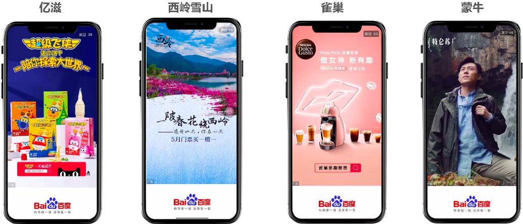 百度開屏廣告有四種展現形式,分別是3-5s靜態全屏/非全屏樣式、動態視頻全屏/非全屏樣式、搖一搖樣式和九宮格樣式。采用全屏覆蓋的展示形式可以集中用戶的注意力,吸引用戶眼球,提高點擊率。