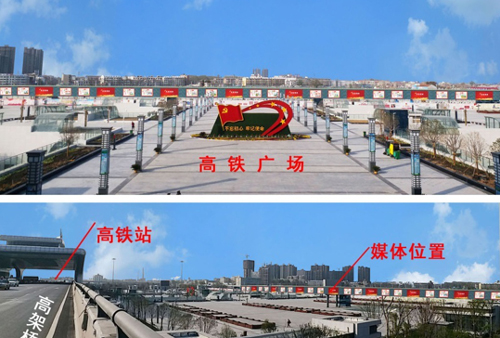 該媒體位于商丘站核心區高鐵站正對面。西有凱旋路,東有歸德路,媒體兩側緊靠車流量較多的高架橋出入口,正前方是人口密集的高鐵廣場,交通樞紐四通八達,廣告位置明顯,視覺沖擊力強。無論是從高架橋上、高鐵廣場里或者高鐵站進出站口處,都是最顯著的媒體。