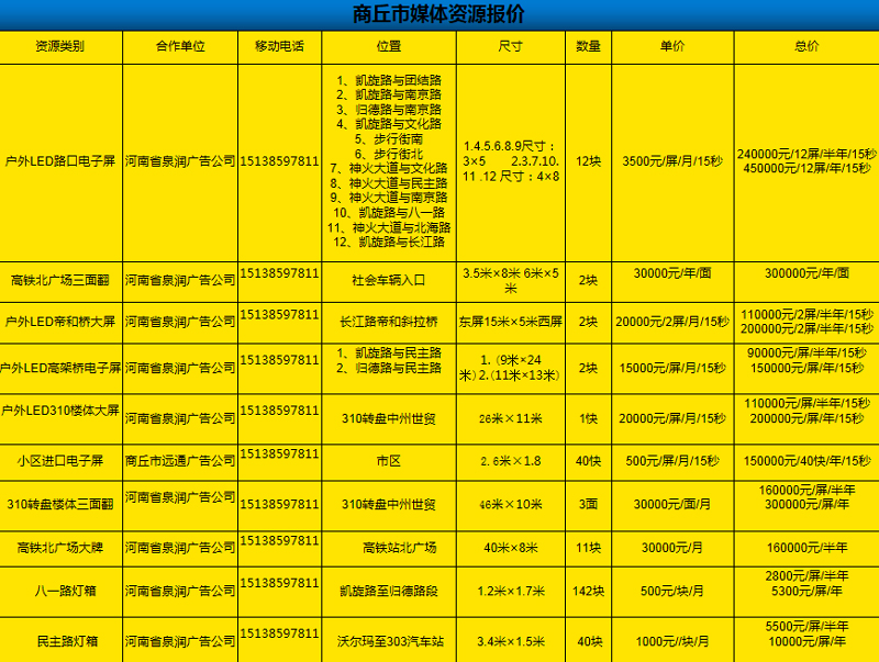 以上是商丘市所有的戶外媒體廣告,最后為您推薦全面的媒體廣告報價: