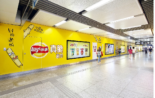 組合形式 :動(dòng)感長(zhǎng)廊(6組12塊雙聯(lián)65寸LCD+82.6㎡墻貼)+12根站廳包柱+13塊6封站廳燈箱+玻璃貼(不少于20塊)