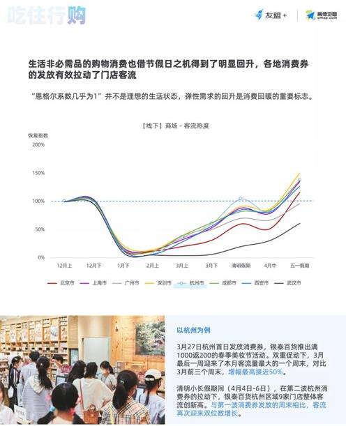 盡管不少剁手黨在疫情期間習慣線上消費,但線下商超獨特的體驗優勢,使其依然受到青睞,加上各地發放消費券,有效拉動門店客流。杭州商場客流熱度在清明假期率先恢復至疫情前水準,除武漢外,其他城市則在4月中下旬到五一假期陸續重現昔日榮景。