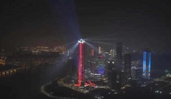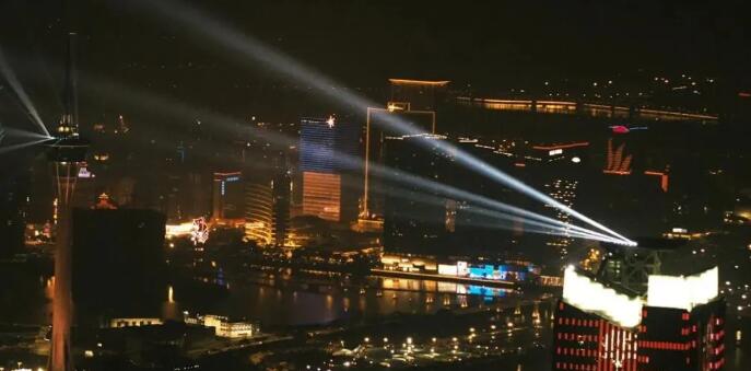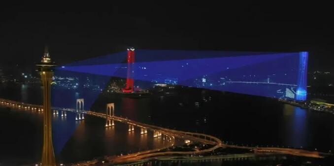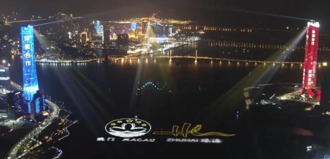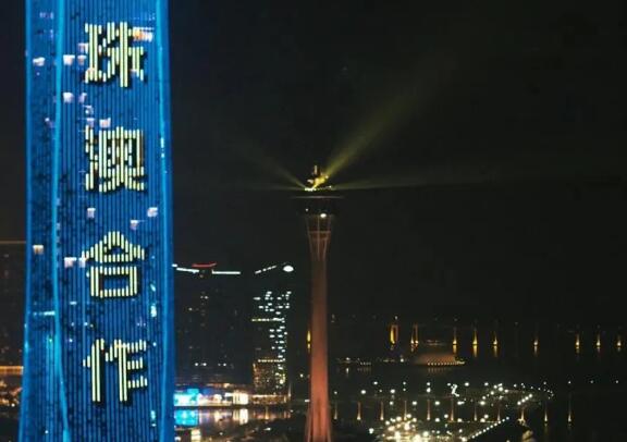 當晚,珠澳兩地三座地標建筑——330米的珠海中心大廈、339米的橫琴國際金融中心(橫琴IFC)和338米的澳門觀光塔(澳門塔)變身“城市燈塔”,通過樓頂?shù)?strong>激光和燈光裝置,在濠江江面共同獻上了一場流光盛宴。